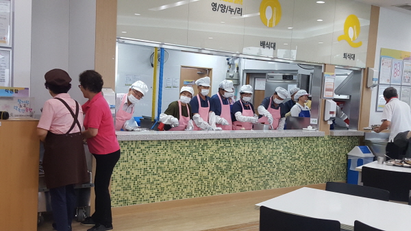 이날 봉사단은 복지관을 방문해 원활한 배식을 위한 교육을 듣고 식기정리, 식당 청소 등의 준비를 마치고, 당일 100여 명의 어르신에게 직접 배식 봉사를 했다.