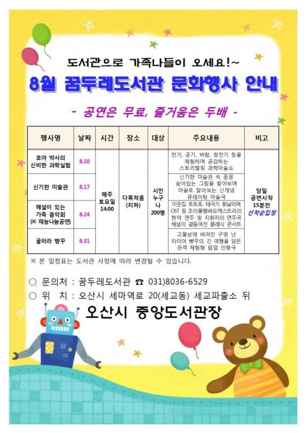 오는 8월에도 아이들에게 생동감 넘치는 체험활동 공간, 어른들에게는 책과 문화예술이 어우러지는 쉼터로 온가족에게 즐거움을 선사하는 다양한 행사와 이벤트를 운영할 계획이다.