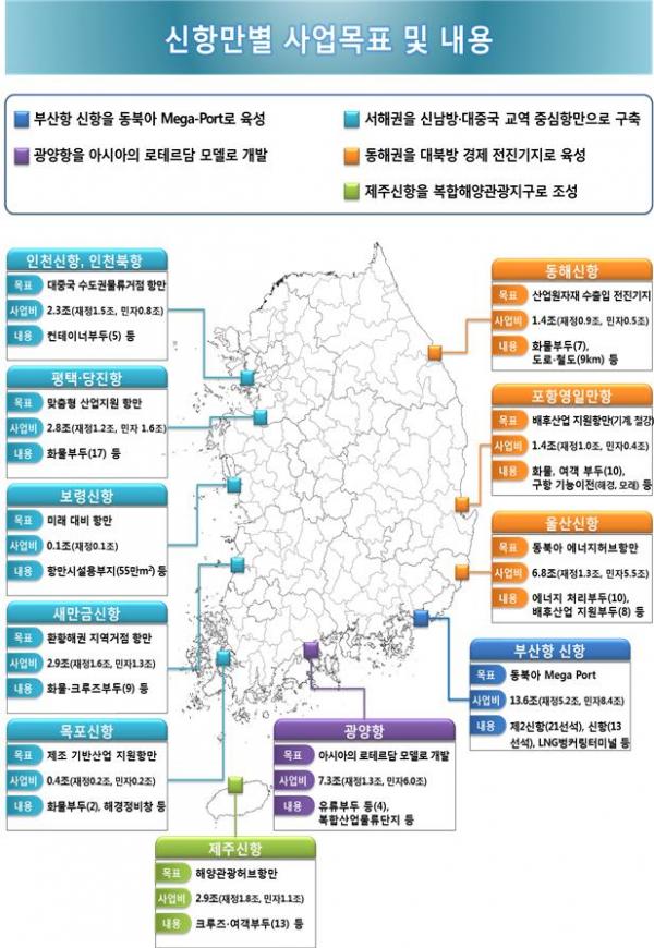 해양수산부는 제1차 신항만건설기본계획 고시 이후 전국 10개 신항만에 부두 156선석, 배후부지 1,176만m2을 조성하여 신항만의 활성화를 도모하고 국가경제 발전을 뒷받침해왔다. 특히 부산항 신항은 지난해 2,166만 TEU의 컨테이너를 처리하는 등 컨테이너 물동량 기준 세계 6위, 환적물량 기준 세계 2위 항만으로서 입지를 다졌으며, 광양항도 지난해 세계에서 11번째로 3억 톤 이상의 화물을 처리하는 종합물류항만으로 성장했다.