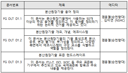 세 번째로 ‘분산원장기술 표준 랜드스케이프’ 문서는 ISO, ITU-T 등 주요 국제표준화기구에서 수행중인 분산원장기술 국제표준화 현황을 제공하여 추가 개발이 필요한 국제표준화 아이템을 식별하고 향후 국제표준화에 대한 로드맵을 구축하는데 도움을 줄 것으로 기대된다.