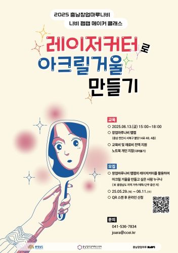 미디어라이프 중부신문 임정헌 기자 | 충남창조경제혁신센터는 오는 6월 13일 2025 충남창업마루나비 팹랩 메이커 클래스 “아크릴 거울 만들기” 교육 프로그램을 운영한다고 밝혔다.