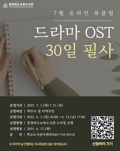 미디어라이프 중부신문 임정헌 기자 | 충청북도교육청 직속기관 교육도서관은 6월부터 9월까지 학부모와 지역주민을 대상으로 '온라인 북클럽-필사과정'을 운영한다고 밝혔다.