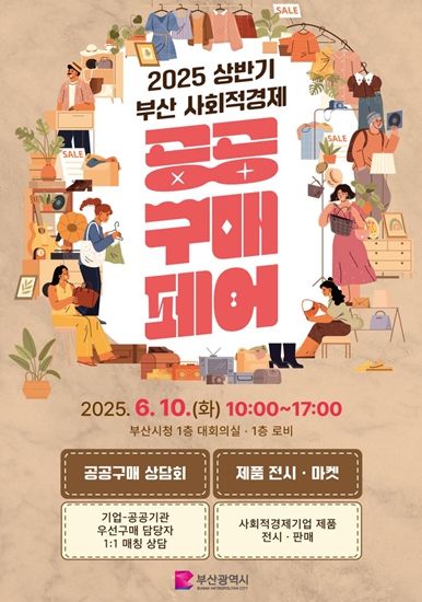미디어라이프 중부신문 임정헌 기자 | 부산시는 내일(10일) 오전 10시 시청 대회의실과 1층 로비에서 '2025 상반기 부산 사회적경제 공공구매 페어'를 개최한다고 밝혔다.