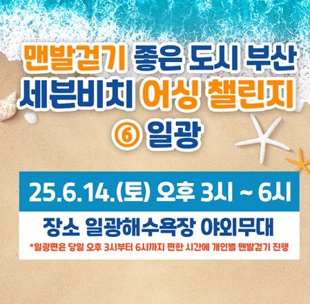 미디어라이프 중부신문 임정헌 기자 | 부산시는 오는 14일 오후 3시 일광해수욕장 일원에서 '맨발걷기 좋은 도시 부산, 세븐비치 어싱챌린지' 여섯 번째 편을 개최한다고 밝혔다.