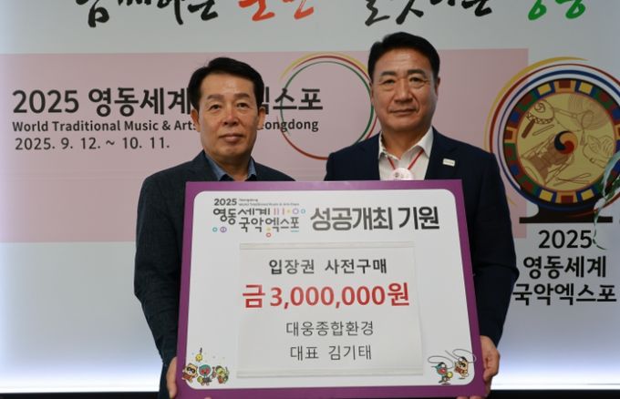 미디어라이프 중부신문 임정헌 기자 | 대웅종합환경(대표 김기태)은 9일 영동군청을 찾아 2025 영동세계국악엑스포의 성공적인 개최를 기원하며 입장권 사전 구매금 300만원을 전달했다.