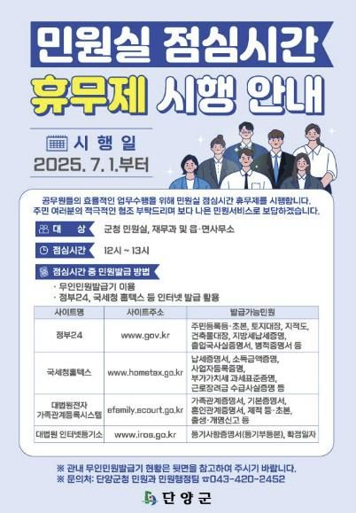 점심시간(12:00∼13:00) 동안에는 민원창구 운영이 일시 중단되며, 이 시간에는 무인민원발급기와 정부24, 국세청 홈택스 등 온라인 서비스를 통해 각종 민원서류 발급이 가능하다.