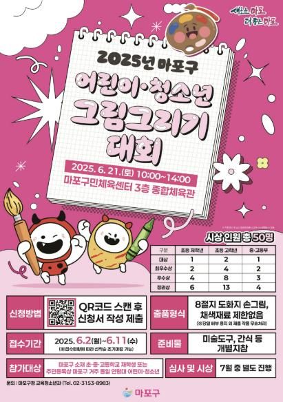 ‘마포구 어린이·청소년 그림 그리기’ 대회는 6월 21일 오전 10시부터 오후 2시까지 마포구민체육센터 3층 종합체육관에서 열린다. 그림 주제는 공정한 대회 진행을 위해 현장에서 당일 공개된다.