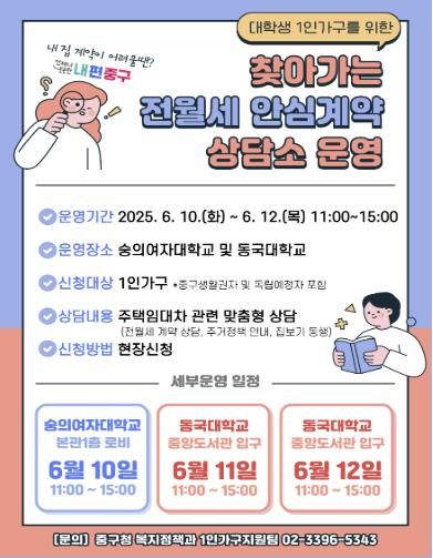 상담 대상은 중구에 거주하고 있거나 거주 예정인 대학생 1인 가구 또는 독립을 준비 중인 대학생으로, 현장에 방문하면 누구나 상담받을 수 있다.