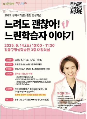 미디어라이프 중부신문 임정헌 기자 | 강동구는 오는 6월 14일 강동구평생학습관에서 느린 학습자 양육자 교육 ‘느려도 괜찮아! 느린 학습자 이야기’ 특강을 개최한다고 밝혔다.