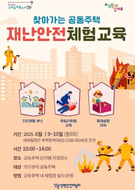이에 더하여, ‘찾아가는 공동주택 재난안전 체험교육’도 운영한다. 지진 훈련, 화재 발생 시 대피 및 초동 대처 방법, 기도 폐쇄(하임리히법) 응급처치 등 체험형 교육을 진행하여, 재난 및 사고 상황에 대한 경각심을 일깨우고 위기 시 대처 능력을 강화하는 취지다.
