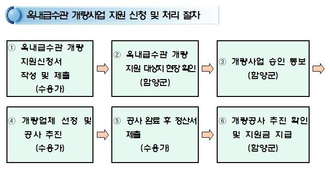 노후 옥내급수관 개량지원 사업은 함양군 상하수도사업소 유수관리담당을 방문하여 신청서 접수 후 서류 검토 및 현장 조사를 거쳐 지원 여부를 최종 판단하여 대상자를 선정할 계획이다.