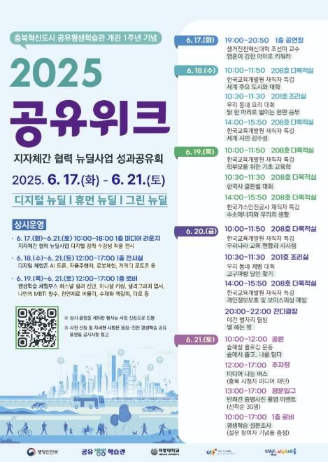 ‘공유 위크’는 디지털 뉴딜, 휴먼 뉴딜, 그린 뉴딜을 테마로 △디지털 기술 체험 △평생학습 특강과 성과 전시 △환경·생태 기반 시민참여 프로그램 등 다채로운 행사를 선보일 예정이다.