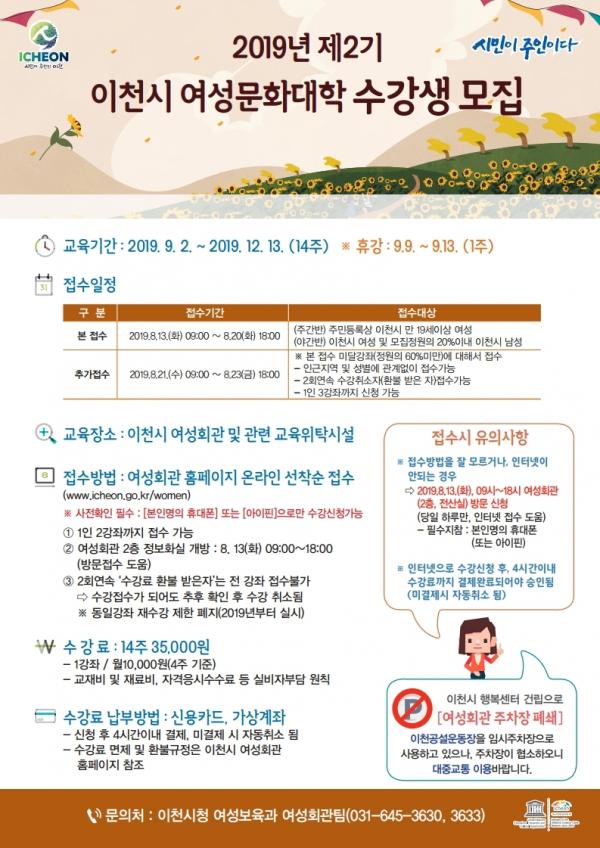 접수는 오는 13일부터 23일까지 이천시 여성회관 홈페이지를 통해 온라인 선착순으로 수강생을 모집한다.