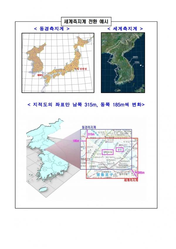 세계측지계 변환은 지적·임야도에 등록된 토지경계는 변하지 않고 위치만 남동쪽으로 365m 이동되는 것으로, 실제 토지의 위치는 변동되지 않으며, 권리면적, 토지소유권과 그 이외의 권리관계 등에도 영향을 주지 않는다.