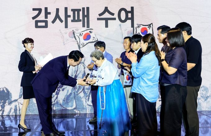 정명근 화성특례시장은 15일 열린 제80주년 광복절 기념식에서 정은산, 안경덕, 우영규, 홍열후, 안순필 선생의 후손에게 감사패를 전달하고, 유가족과 함께 ‘광복 80주년을 함께 기억하자’라는 의미를 담아 핸드 프린팅 퍼포먼스를 펼치기도 했다.