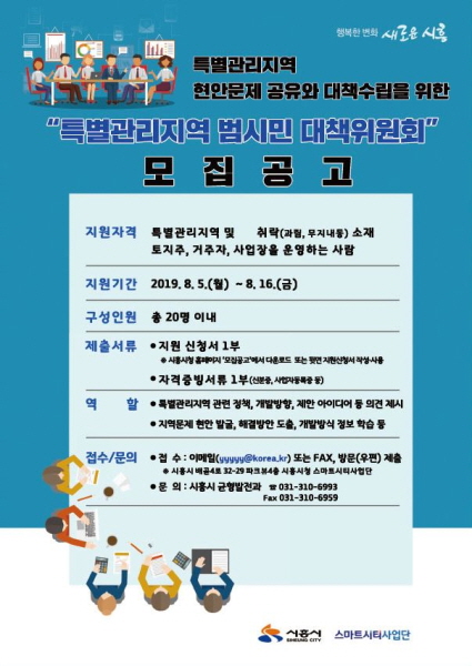 신청은 시흥시청 홈페이지 고시공고에 있는 ‘특별관리지역 범시민 대책위원회 모집 공고문’에서 지원서 등을 내려 받아 작성하고, 직접방문 또는 전자우편, 팩스 등의 방법으로 제출하면 된다.