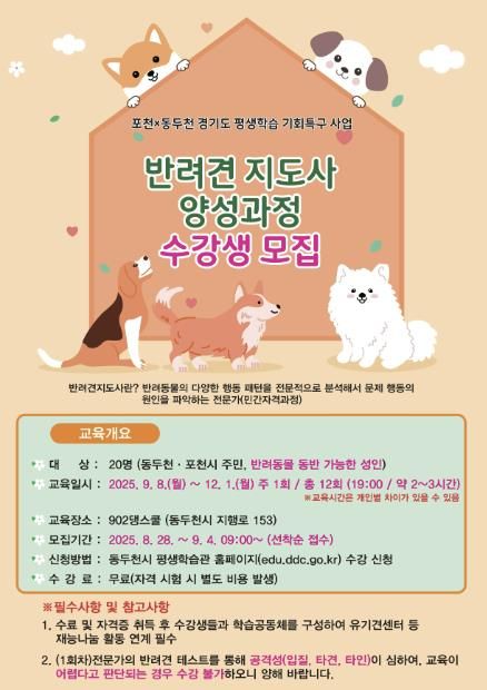 미디어라이프 중부신문 이도경 기자 | 동두천시는 8월 28일부터 9월 4일까지 ‘2025년 반려견 지도사 양성과정’ 수강생을 모집한다고 밝혔다. 이번 과정은 반려견의 행동을 전문적으로 분석하고 문제 행동의 원인을 파악할 수 있는 전문가를 양성하기 위해 마련됐다.
