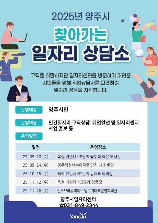 상담은 별도의 사전 신청 없이 신분증을 지참하여 현장 참여가 가능하며, 취업을 희망하는 시민 누구나 무료로 이용할 수 있다. 자세한 사항은 양주시 일자리센터로 문의하면 된다.