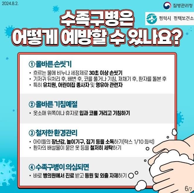 평택보건소 관계자는 “수족구병은 예방백신이 없어 손 씻기와 환경관리 등 예방수칙 준수가 가장 중요”하다고 강조하면서, “특히 영유아 보육시설에서는 주변 환경을 철저히 소독 및 관리하고, 수족구병에 걸린 영유아는 완전히 회복한 후 등원할 수 있도록 안내할 것”을 당부했다.