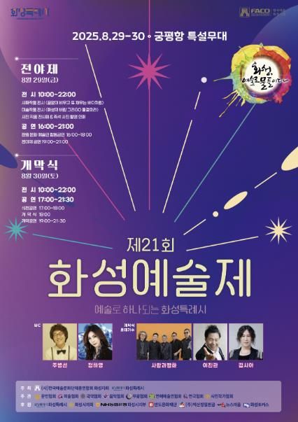 정명근 화성특례시장은 “화성예술제는 시민과 예술인이 함께 어우러져 지역 문화예술의 가치를 높이는 소중한 자리”라며, “이번 축제에 많은 시민들께서 오셔서 다양한 공연과 전시를 즐기고, 우리 지역 예술인들의 열정과 창작의 힘을 직접 느껴보시길 바란다”고 말했다.