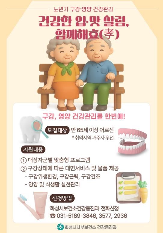 미디어라이프 중부신문 이종인 기자 | 화성특례시가 9월부터 12월까지 서부권 취약지역 거주 65세 이상 어르신을 대상으로 맞춤형 구강·영양 관리 시범사업을 운영한다고 28일 밝혔다.