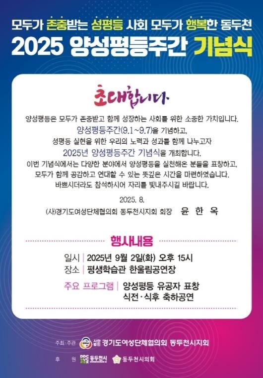 미디어라이프 중부신문 이도경 기자 | 동두천시는 양성평등주간(9월 1일~7일)을 맞아 오는 9월 2일 오후 3시 평생학습관 한울림공연장에서 2025년 양성평등주간 기념식을 개최한다고 밝혔다.