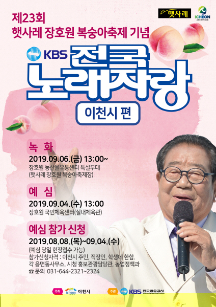 시 관계자는 “전국노래자랑이 9월 20일부터 3일간 펼쳐지는 햇사레 장호원 복숭아축제 홍보에 큰 도움을 줄 것으로 기대하고 있다”며 “다함께 즐기며 장호원복숭아도 널리 알릴 수 있는 시간이 될 수 있도록 많은 관심과 참여를 부탁드린다”고 말했다.