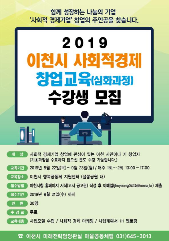 수강 신청은 이천시민이면 누구나 가능하며, 8월 21일까지 시청 홈페이지 고시·공고란의 ‘2019년 사회적경제 창업교육 심화과정 실시’ 게시글에 첨부된 창업교육 신청서를 작성한 후 이메일을 통해 접수하거나 시청 미래전략담당관실을 방문 신청하면 된다.