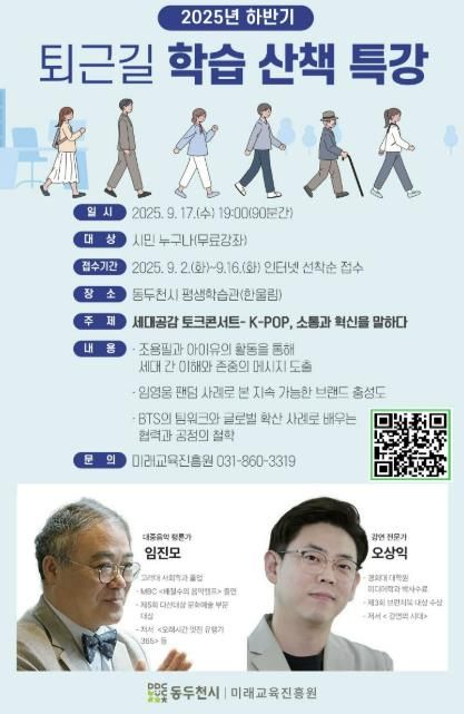 미디어라이프 중부신문 이도경 기자 | 동두천시는 오는 9월 17일 오후 7시 평생학습관에서 시민 누구나 참여할 수 있는 2025년 하반기 퇴근길 학습 산책 특강을 연다.