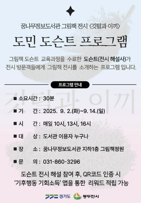 미디어라이프 중부신문 이도경 기자 | 동두천시 도서문화사업소 꿈나무정보도서관은 9월 14일까지 열리는 ‘깃털과 이끼’ 그림책 전시의 원활한 운영을 위해 전문적으로 양성된 ‘경기도민 그림책 도슨트’와 함께 전시 해설 프로그램을 진행한다.