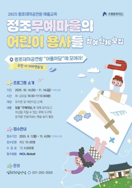 미디어라이프 중부신문 이종인 기자 | 수원문화재단은 오는 10월 14일부터 11월 14일까지 정조테마공연장 어울마당에서 ‘2025 정조테마공연장 예술교육 '정조무예마을의 어린이 용사들'’을 진행한다.