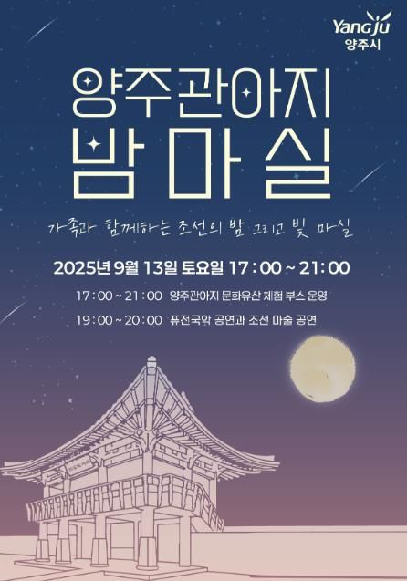 미디어라이프 중부신문 이도경 기자 | 양주시가 오는 13일, 양주관아지에서 가을밤의 낭만과 전통의 멋을 한껏 느낄 수 있는 특별한 야간 문화행사 '양주밤마실'을 개최한다고 밝혔다.