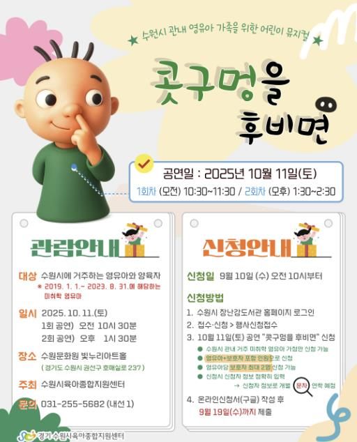 미디어라이프 중부신문 이종인 기자 | 수원시육아종합지원센터는 추석 연휴를 맞아 10월 11일 수원시 빛누리아트홀에서 어린이 뮤지컬 ‘콧구멍을 후비면’을 상연한다.