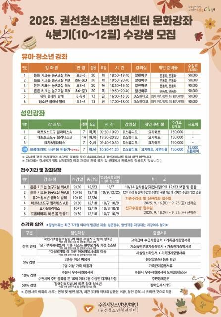 미디어라이프 중부신문 이종인 기자 | 수원시청소년청년재단 권선청소년청년센터는 오는 9월 16일부터 9월 26일까지 지역사회 평생학습 문화강좌 4분기(10~12월) 수강생을 모집한다.