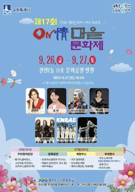 김철환 권선2동 주민자치회장은 “온정마을 문화제는 주민이 서로의 재능과 정을 나누며 마을 공동체의 가치를 되새기는 축제”라며 “전 세대가 공감할 수 있는 공연과 프로그램 등을 통해 함께 즐기는 소통의 장이 되길 바란다”라고 전했다.