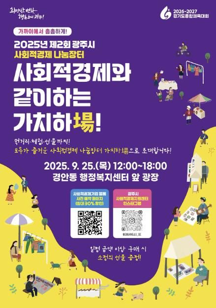 미디어라이프 중부신문 이종인 기자 | 광주시는 오는 25일 낮 12시부터 오후 6시까지 경안동 행정복지센터 앞 광장에서 ‘2025년 제2회 광주시 사회적경제 나눔장터(별칭: 사회적경제와 같이하는 가치하場!)’를 개최한다고 15일 밝혔다.
