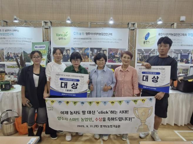미디어라이프 중부신문 이도경 기자 | 양주시는 지난 11일 경기도농업기술원에서 열린 ‘2025년 경기도 농업인 스마트경영 혁신대회’에 참가한 양주시사이버농업인연구회가 스마트콘텐츠(고령) 분야와 스마트경영(개인) 분야에서 각각 대상을 수상했다고 밝혔다.