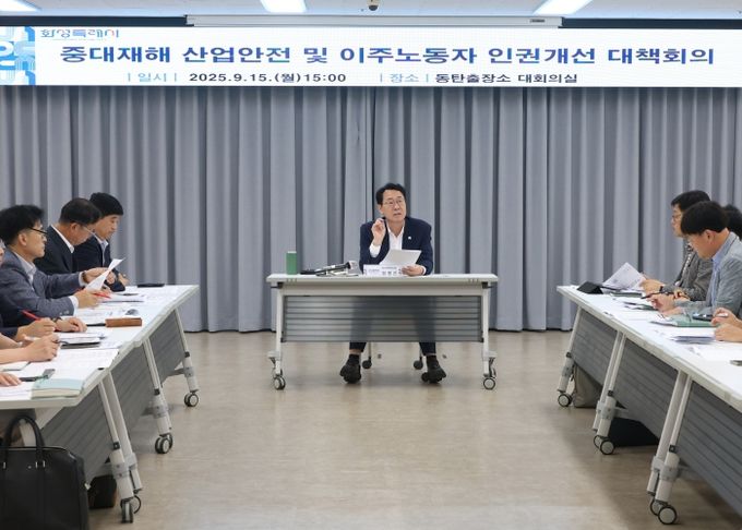미디어라이프 중부신문 이종인 기자 | 정명근 화성특례시장은 15일 동탄출장소 대회의실에서 ‘중대재해 산업안전 및 이주노동자 인권개선 대책 회의’를 열고 안전하고 공정한 노동 환경 조성을 위한 방안을 논의했다.