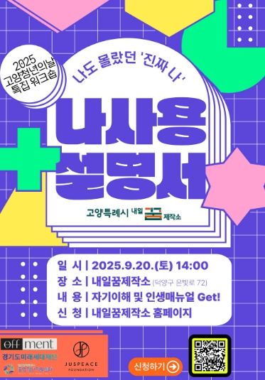 ‘2025 고양청년의 날’축제는 9월 20일 토요일 오후 1시부터 저녁 6시까지 진행되며,‘나 사용 설명서’워크숍은 내일꿈제작소 A동 4층 강당에서 오후 2시부터 4시까지 진행된다.