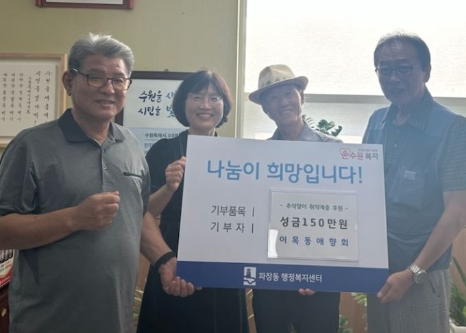 미디어라이프 중부신문 이종인 기자 | 수원시 장안구 파장동은 지난 18일, 이목동 애향회에서 추석을 맞이하여 홀로 계신 어르신과 저소득 취약계층 등 소외된 이웃들에게 힘이 되고자 성금 150만원을 기부했다고 밝혔다.