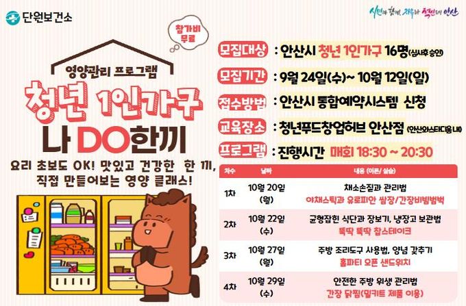 모집 대상은 관내 청년 1인가구 16명이며, 참가비는 무료다. 참여를 원하는 시민은 안산시 통합예약시스템 누리집에서 신청하면 되며, 대상 요건을 확인해 최종적으로 선정한다.