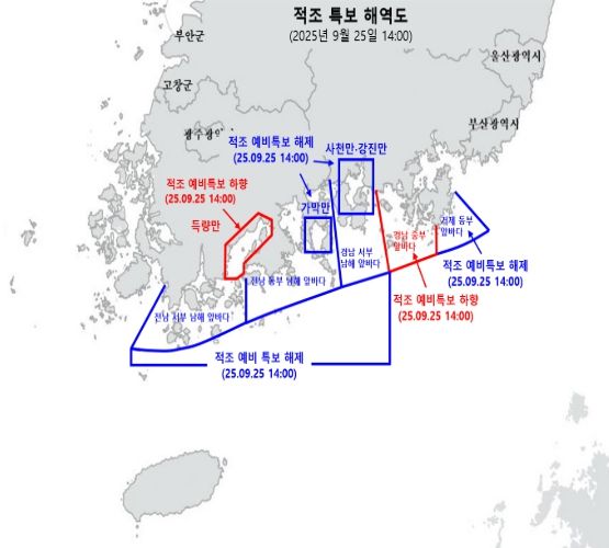 미디어라이프 중부신문 이도경 기자 | 해양수산부는 9월 25일 16시부로 적조 위기경보 단계를 ‘경계’에서 ‘주의’로 하향 조정한다고 밝혔다.