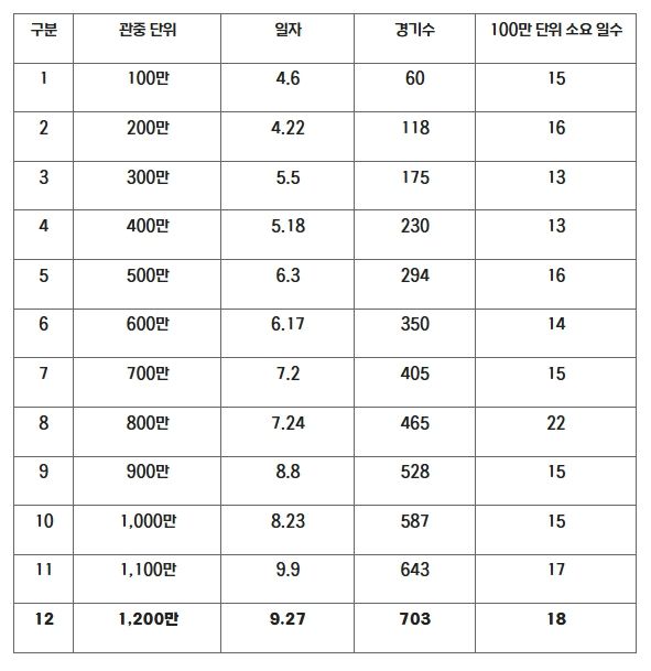 올 시즌 KBO 리그는 100만명 단위 관중 달성을 모두 역대 최소 경기로 달성한 바 있다. 또한, 지난 8월 23일 2시즌 연속 1,000만 관중 달성, 9월 5일 역대 한 시즌 최다 관중 신기록 달성, 9월 9일 역대 최초1,100만 관중 달성에 이어 1,200만 관중을 달성하며 또 한번 새로운 기록을 작성하게 됐다.