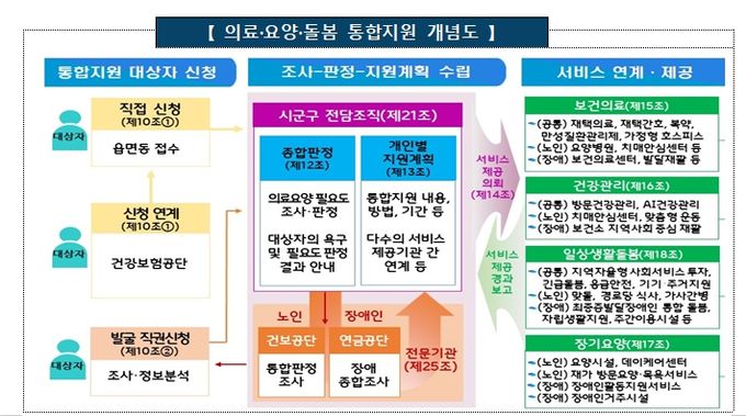 이러한 환경변화 및 요구에 대응하기 위해, 정부는 시범사업 등 통합돌봄의 제도화를 추진해 왔으며, 일상생활 수행에 어려움을 겪는 사람이 살던 곳에서 건강한 생활을 영위하도록 의료·요양·돌봄 서비스를 통합·연계하는 '의료·요양 등 지역 돌봄의 통합지원에 관한 법률(돌봄통합지원법)'이 ’24년 3월 제정되어 내년 3월 전국적인 본사업 시행을 앞두고 있다.