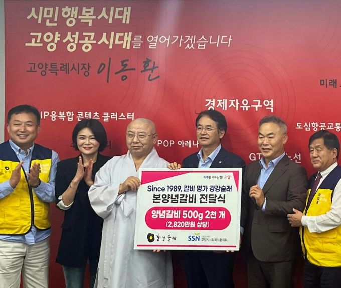 미디어라이프 중부신문 이종인 기자 | ㈜전한의 외식브랜드 강강술래(대표 노상환)가 10월 10일, 고양특례시에 본양념갈비 500g 2,000개(2,820만 원 상당)를 기탁했다. 이번 전달식은 고양특례시청 열린시장실에서 진행됐으며, 이동환 고양특례시장, 김민숙 고양특례시의원(고양, 관산, 원신), 노상환 강강술래 대표, 김응화 고양시사회복지협의회 회장이 함께 자리했다.