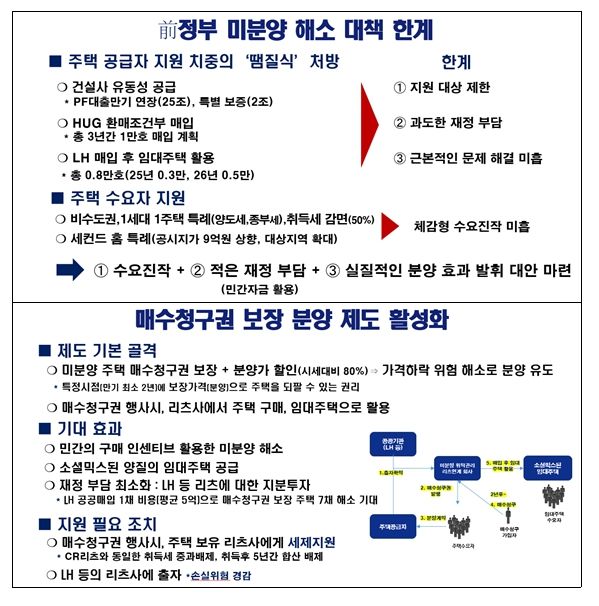 안 의원은 재정 부담은 최소화하면서도 분양 효과를 높일 수 있는 실질적 대안으로 ‘매수청구권 보장 분양제도’를 제안했다. 이 제도는 ▲미분양 주택의 분양가를 시세의 80% 수준으로 할인하고, ▲수분양자에게 매수청구권을 부여해 가격 하락 위험을 완화함으로써 민간 수요를 유인하는 방식이다.