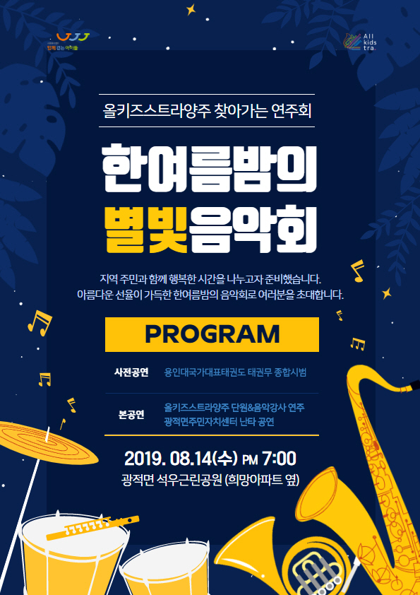 음악회는 용인대학교 태권무 공연을 시작으로, 지역 주민들의 난타공연, 올키즈스트라 양주의 ‘신세계 교향곡’을 비롯한 아름다운 연주 등 다채로운 무대를 통해 그 의미와 감동을 더할 예정이다.