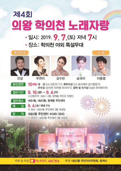 신청 자격은 내손1·2동 및 청계동 주민 또는 직장인이면 누구나 신청할 수 있으며, 본선에 앞선 예심은 9월 4일 저녁 7시 내손2동 주민센터 3층 대강당에서 진행된다.