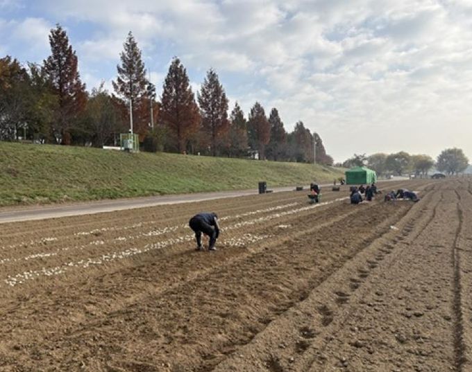 튤립 구근은 지난 11일 행정복지센터로 배송됐으며, 즉시 식재 작업이 본격적으로 시작됐다. 이틀간 노인일자리 참여자 50여 명이 투입돼 대량의 구근 껍질을 신속히 제거했고, 직원들은 구근을 공릉천 현장으로 이송했다. 현장에서는 기간제 및 공공근로 인력이 곧바로 식재 작업에 돌입했다.