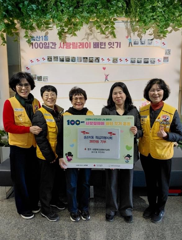 미디어라이프 중부신문 이석호 기자 | 의정부시 송산1동주민센터는 12월 2일 대한적십자사 송산1동적십자봉사회가 ‘100일간 사랑릴레이 배턴 잇기’에 동참해 사랑의 성금 20만 원을 기탁했다고 밝혔다.